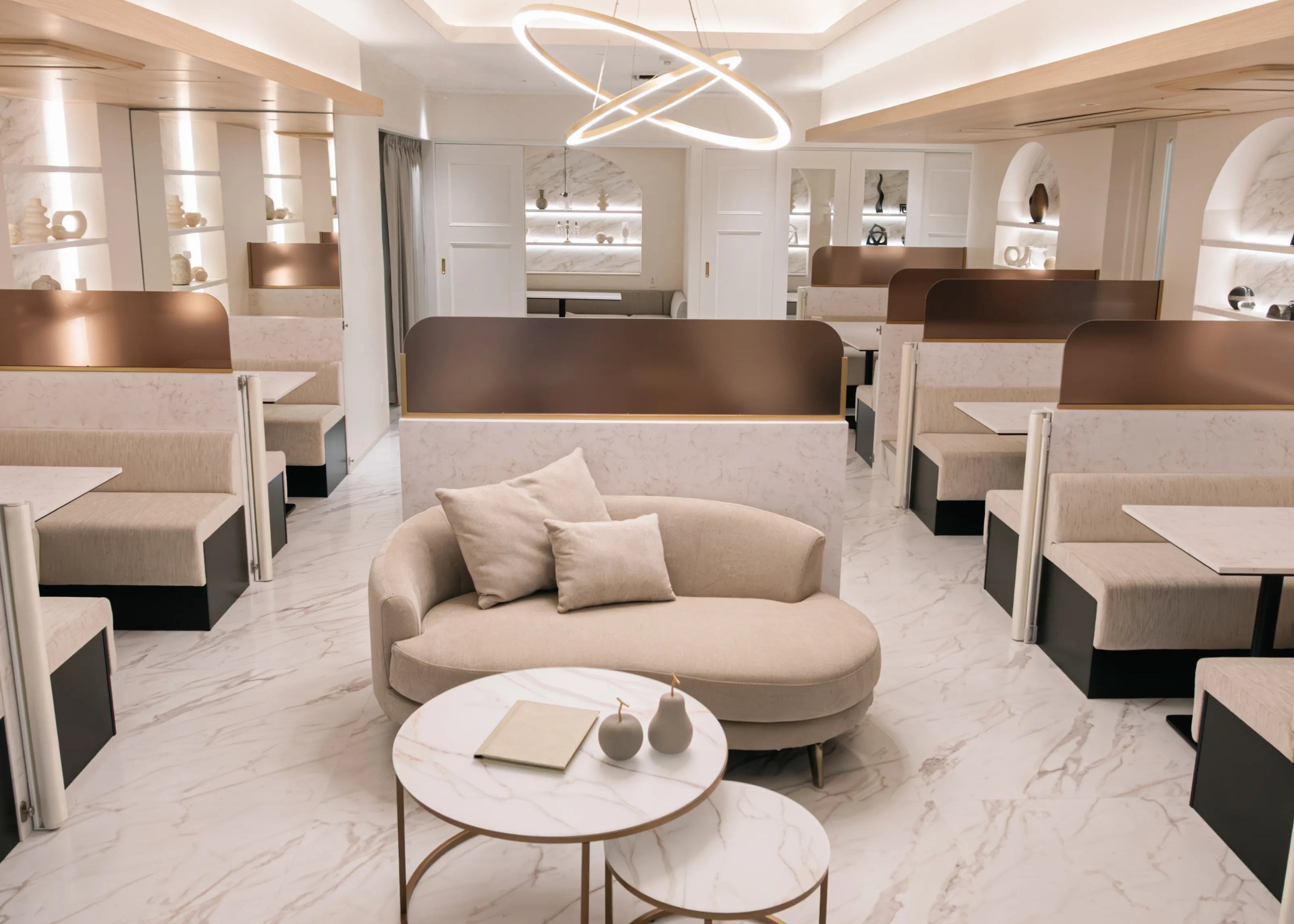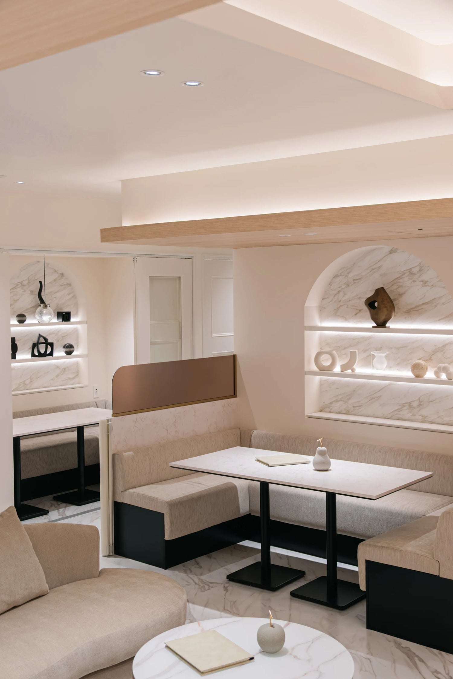 店内は、獣医師監修のもと、わんこにとって居心地の良い空間を追求。ホテルラウンジのような内装の中に、プライベート空間を確保し、愛犬とのコミュニケーションを妨げない設計です。獣医師アドバイスのもと開発されたメニュー、わんこ用アメニティ、必要な子だけが使うオムツ他など、細やかなおもてなしで皆様をお迎えします。わんこ連れでないお客様も歓迎いたします。